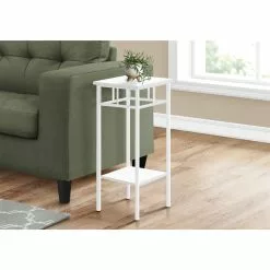 Neatly display and store objects on the surfaces offered by this 2-tier accent table. The square tabletop is ideal for taller items, such as a lamp, or for resting a mobile device or beverage you want to keep within reach as you sit on a couch or bed. Underneath is a storage shelf that provides a convenient surface for books, storage boxes, or folded blankets. The tabletop and shelf panels are in an alluring white finish and are supported by a slender white metal base. Compact and finished on all sides, this end table with storage makes a versatile and stylish side table or nightstand in a living room or bedroom with limited space.