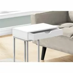 Tired of holding a beverage in your hand and a bowl of popcorn in your lap while binge watching? This C table keeps them within easy reach so you can sit back and enjoy the show. The C-shaped base slides under your sofa or chair, placing the table surface close to you. For added convenience, the top includes a storage drawer that is accessible from both sides. Use it to hide away mobile devices to avoid interruptions while you’re watching TV, then store remotes in it when you’re done. Stylish and versatile, this portable accent table features a top in a smooth, white laminate finish and a metal frame in silver that adds a modern look wherever you need a small side table with storage.