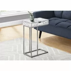 Tired of holding a beverage in your hand and a bowl of popcorn in your lap while binge watching? This C table keeps them within easy reach so you can sit back and enjoy the show. The C-shaped base slides under your sofa or chair, placing the table surface close to you. For added convenience, the top includes a storage drawer that is accessible from both sides. Use it to hide away mobile devices to avoid interruptions while you’re watching TV, then store remotes in it when you’re done. Stylish and versatile, this portable accent table features a top in a smooth, white marble-look laminate finish and a metal frame in silver that adds a modern look wherever you need a small side table with storage.