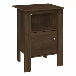 Bring an industrial and contemporary design together with this dark walnut nightstand that can also be placed beside the couch as an end table or accent table. In a compact format, it has ample surface space for a few decorations, books or a laptop/tablet thanks to an open shelf and closed cabinet with a beautiful square silver knob. Make your small home, apartment or condo feel nice and homey and draw some attention to your stylish dark walnut finish side table.