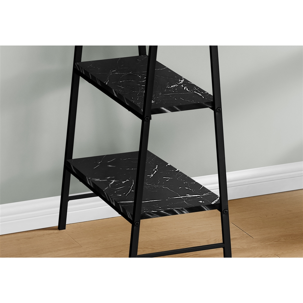 - Thick, rectangular desktop and 4 shelves in 2 different sizes are finished in a non-glossy, black marble-look laminate