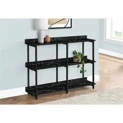 Proudly display prized possessions on this rectangular console table with 3-tier shelving. Underneath the long, narrow tabletop are shelves arranged on 2 levels. Distribute books, plants, and decorative items among the tabletop and shelves, which are in an elegant black marble-look laminate finish. The sturdy metal frame in black finish features clean lines and right angles for a modern look. With its narrow profile and generous display space, this versatile accent table with storage is ideal for a hallway, an entryway, or behind a sofa in a living room.