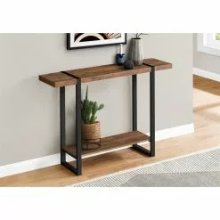 Industrial-farmhouse style combines modern metal with a rustic wood finish to create a warm, inviting look. This two-tier rectangular console table embodies that popular style. The tabletop and bottom shelf are finished in a brown reclaimed-wood look with naturalistic colour variations and a subtle wood-grain texture. Robust metal legs in a black finish are incorporated into the thick tabletop for a striking visual contrast and to provide stability. This accent table has a narrow profile that makes it ideal for use in an entryway, hallway, or behind a sofa in a living room.