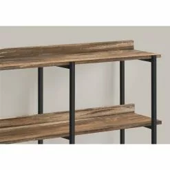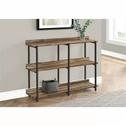 Proudly display prized possessions on this rectangular console table with 3-tier shelving. Underneath the long, narrow tabletop are shelves arranged on 2 levels. Distribute books, plants, and decorative items among the tabletop and shelves, which are in a medium brown reclaimed wood-look finish. The sturdy metal frame in a contrasting black finish features clean lines and right angles for a modern look. With its narrow profile and generous display space, this versatile accent table with storage is ideal for a hallway, an entryway, or behind a sofa in a living room.
