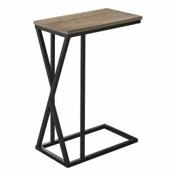 Straight lines and clean angles give this C-shaped accent table an elegantly modern look. The rectangular tabletop in a dark taupe wood-look finish is supported by the black metal frame with intersecting lines that form two asymmetrical triangles. Slide this versatile end table under a sofa or chair to place snacks or mobile devices or use as a side table next to a bed.
