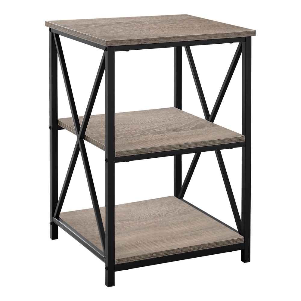 This simple, contemporary style end table with an industrial look is a multi-functional accent piece suitable for any room. The stylish black metal legs with an ? X? design on the two sides, contrasts with the warmth of the dark taupe wood look laminate square tops. The two open bottom shelves offer a convenient storage space for books, magazines, or decorative objects with room on top for a small lamp or a place to set down your drink. Bring it into the bedroom as a sleek and compact nightstand for a clean modern touch. Assembly is required.