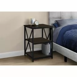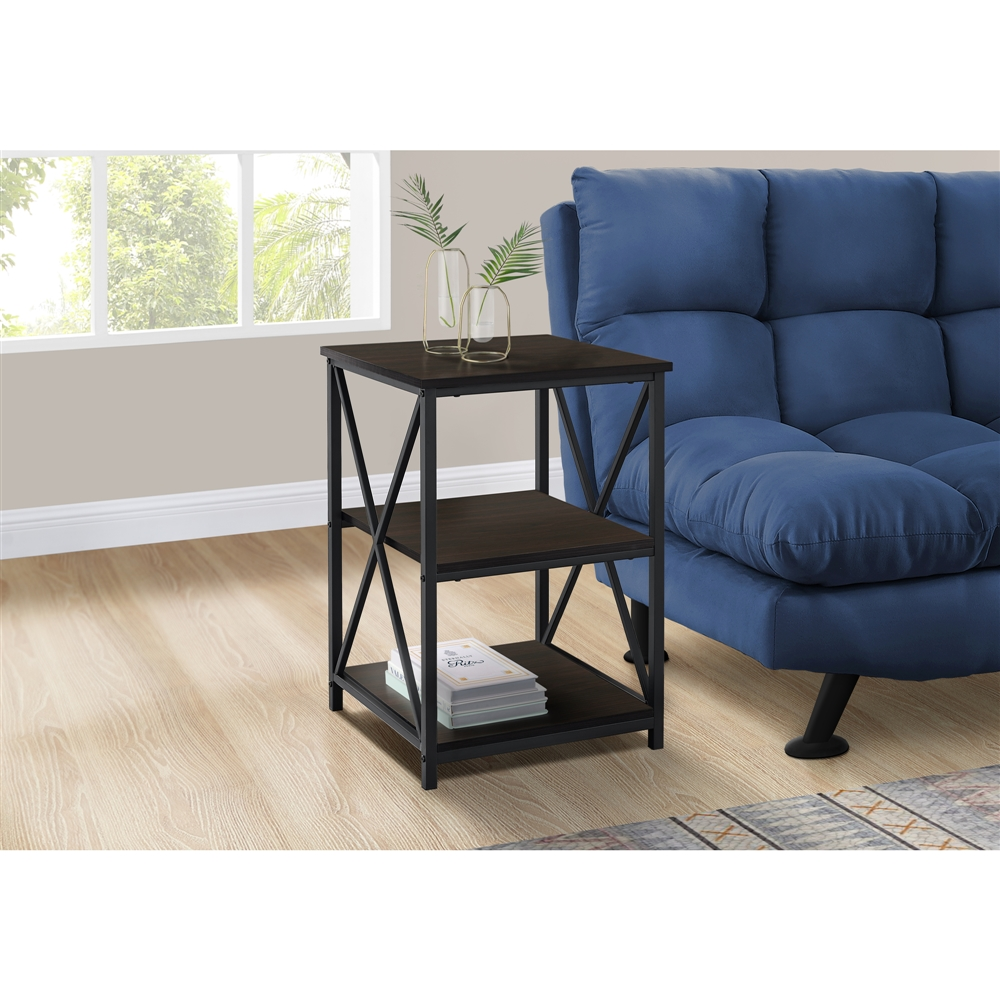This simple, contemporary style end table with an industrial look is a multi-functional accent piece suitable for any room. The stylish black metal legs with an ? X? design on the two sides, contrasts with the warmth of the dark brown espresso wood look laminate square tops. The two open bottom shelves offer a convenient storage space for books, magazines, or decorative objects with room on top for a small lamp or a place to set down your drink. Bring it into the bedroom as a sleek and compact nightstand for a clean modern touch. Assembly is required.