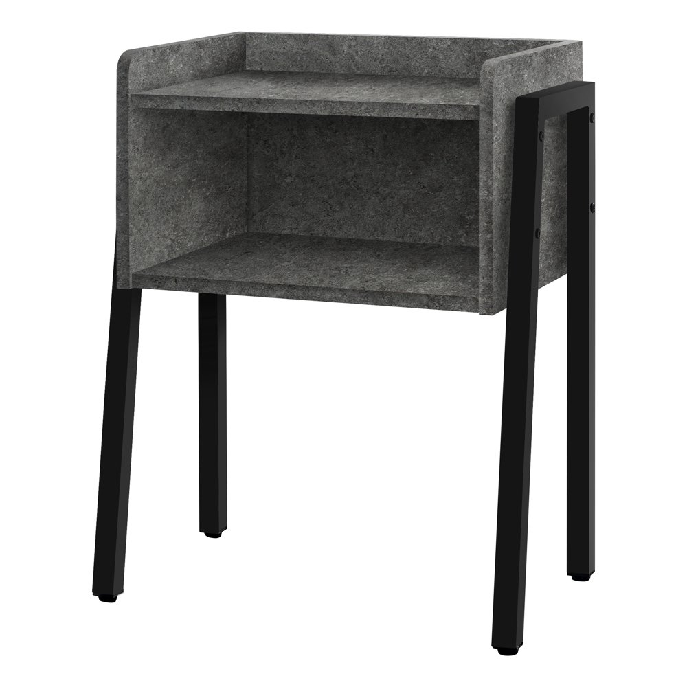 Save space while providing the perfect sidekick to any furniture ensemble. This end table, featuring a grey stone-look, is equipped with an open shelf and modern black metal legs to complete the industrial-inspired design. Made for showing off your favorite decor items or storing books in the living room or family room, this side table can also be used as a bedside table. It is an on-trend piece that is waiting to be added to any living space. Assembly is required.