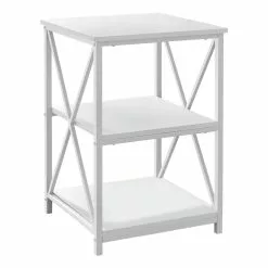 This simple, contemporary style end table with an industrial look is a multi-functional accent piece suitable for any room. The stylish white metal legs with an ? X? design on the two sides blends with the chic white laminate square tops. The two open bottom shelves offer a convenient storage space for books, magazines, or decorative objects with room on top for a small lamp or a place to set down your drink. Bring it into the bedroom as a sleek and compact nightstand for a clean modern touch. Assembly is required.
