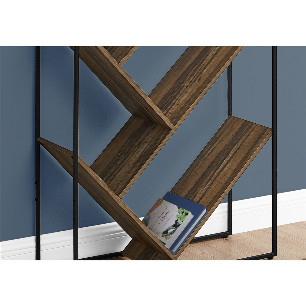 Look at storage from a different angle with this unique bookcase. Slanted shelves in a brown reclaimed wood-look finish with a wood-grain texture create eye-catching geometric angles that form V-shaped display areas in different sizes. The sleek shelving, supported by a black metal frame, give this 5-tier bookshelf a trendy urban style. Finished on all sides, this striking etagere with open shelves will become the center of attention in any room.