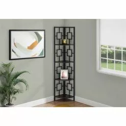 Perfect for photo frames, plants, other decorative items and even kitchen accessories, this transitional-style corner bookcase will upgrade your decor. Including 4 solid espresso colored display shelves, this corner display unit features a three-leg black metal frame and a square transitional design that will add modern flair wherever you choose to place it. This corner etagere bookcase is sure to impress. Assembly is required.