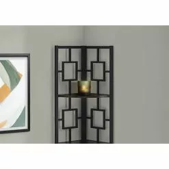 - This corner shelf features a three-leg black metal frame, allowing it to sit tight against the wall
