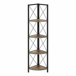 Perfect for photo frames, plants, decorative items and kitchen accessories, this transitional-style corner bookcase will upgrade your decor. Including 4 display shelves, this corner display unit features a 3-leg metal frame and an X-design to add modern flare wherever you choose to place it. This space-saving corner bookcase is sure to impress.