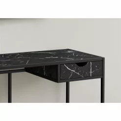 This computer desk with 1 storage drawer delivers stylish simplicity in a space-saving design. The desktop offers room for a laptop and the essentials you need to get work done. On the right, a storage drawer provides a convenient place to keep small supplies within easy reach. The drawer interior is finished in the same black marble-look laminate as the desktop panel and drawer exterior for a clean look. A slim yet sturdy metal frame in a black finish outlines the desktop and storage drawer for a modern-industrial touch. The streamlined style of this compact writing table makes it a great choice if your home office space is in a living room or bedroom.