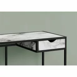 This computer desk with 1 storage drawer delivers stylish simplicity in a space-saving design. The desktop offers room for a laptop and the essentials you need to get work done. On the right, a storage drawer provides a convenient place to keep small supplies within easy reach. The drawer interior is finished in the same white marble-look laminate as the desktop panel and drawer exterior for a clean look. A slim yet sturdy metal frame in a black finish outlines the desktop and storage drawer for a modern-industrial touch. The streamlined style of this compact writing table makes it a great choice if your home office space is in a living room or bedroom.