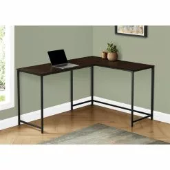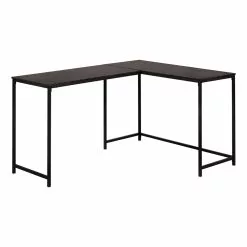 Delivering the best of both worlds, this L-shaped computer desk is both spacious and compact. The large desktop easily accommodates everything you need to be productive and has room to spare for displaying decorative items. Underneath the desktop there’s plenty of space to stretch your legs and place a computer tower. With its L shape, this desk won’t take up too much space when placed in a corner but is finished on all sides so you can position it however you choose in a home office. Both the desktop panels in a rich, dark-brown espresso finish and the black metal base are slender yet sturdy, giving this desk a modern simplicity that coordinates with most décors.