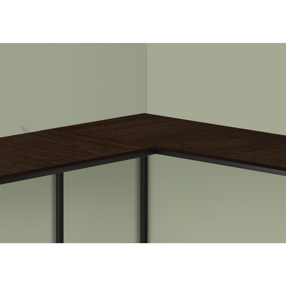- L-shaped corner computer desk with a large desktop surface in a dark-brown espresso finish