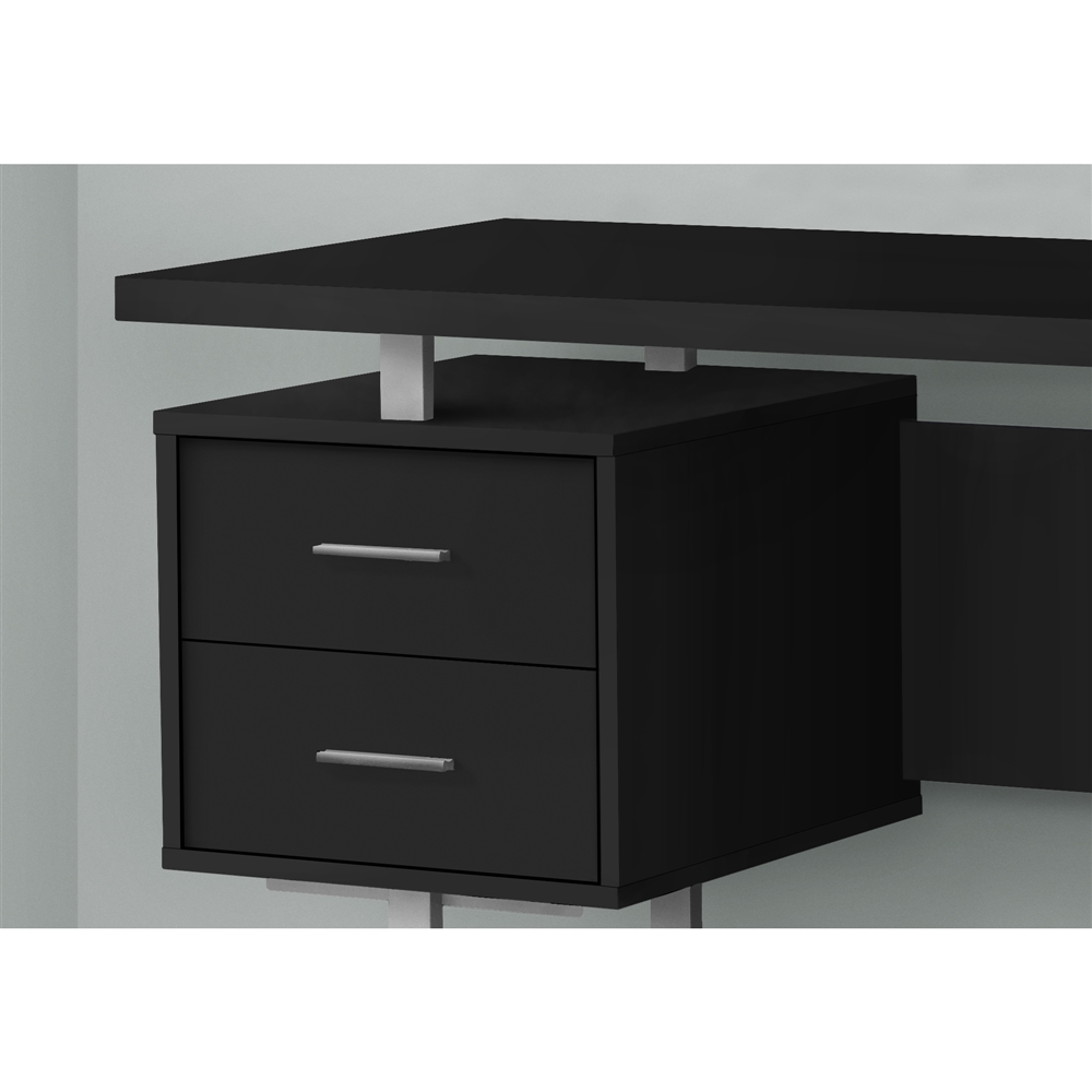 Feel like a boss in your home office when you sit down to work at this mid-size computer desk with 3 storage drawers. The thick-panel floating desktop provides generous room for a laptop and writing materials, and allows you to use the tops of the drawer units as extra surfaces. Finished in the same black laminate as the desktop, 2 small drawers and 1 large drawer with a bar for hanging files offer space for items you want to keep off the work surface. For flexibility, the drawer units are reversible and can be installed on either side according to your preference. Supporting the desk are metal legs in a silver finish with a modern, stylish U shape.