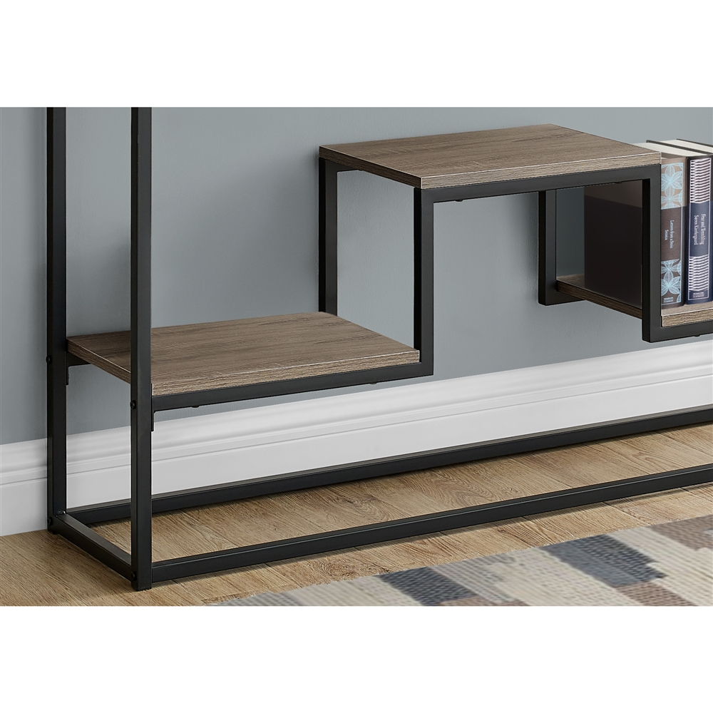 This entryway console table makes it that much easier to show off your books, plants, photos and other decor items. A warm welcome as an entryway table, this piece can also be placed in the living room or bedroom. It features a charming multi-level shelving style with taupe wood look table tops. This accent table makes your small home, apartment or condo look carefully organized and modern. The black metal frame provides extra style.