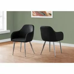 No need to rest your elbows on the table as these dining chairs with armrests provides a convenient place to put them while seated. Designed so that the chairs can be pushed in when not in use, the integrated armrests are set to the perfect height while sleek and comfortable. Upholstered in a black leather-look fabric with minimal stitching for a clean look, the padded back and sides curves around the cushioned seat for a soft feel. Angled and tapered chrome metal legs add a stylish appeal. Sold as a 2-piece set, these chairs have a modern-meet-retro style ideal for an eat-in kitchen or formal dining room, or as accent chairs in other rooms