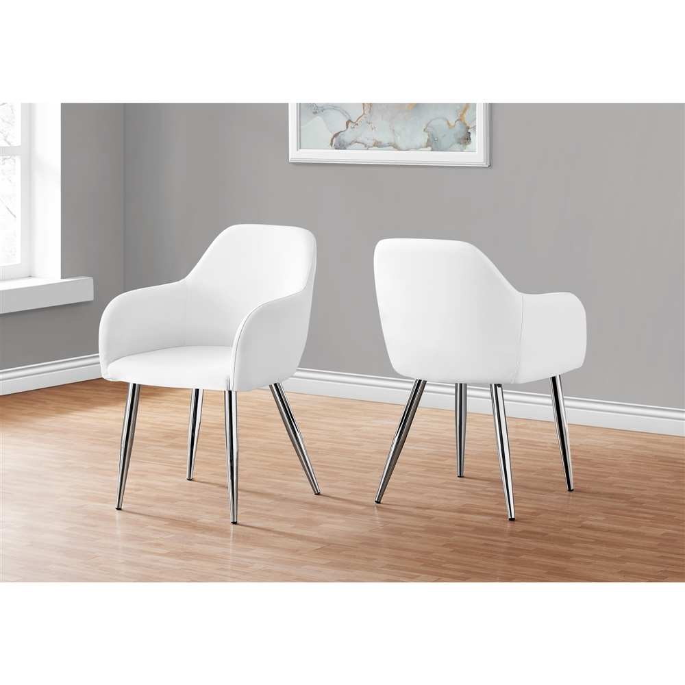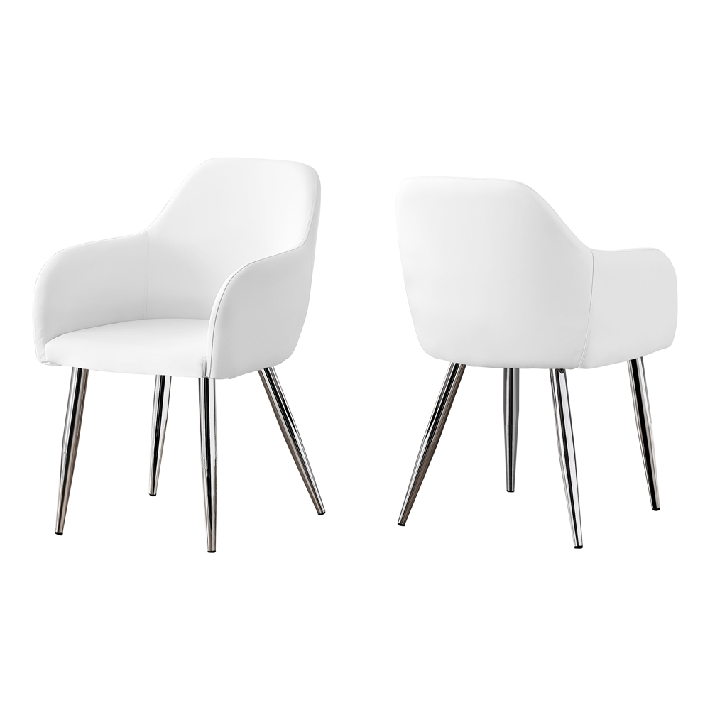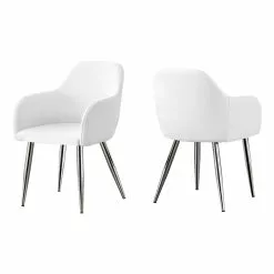 No need to rest your elbows on the table as these dining chairs with armrests provides a convenient place to put them while seated. Designed so that the chairs can be pushed in when not in use, the integrated armrests are set to the perfect height while sleek and comfortable. Upholstered in a white leather-look fabric with minimal stitching for a clean look, the padded back and sides curves around the cushioned seat for a soft feel. Angled and tapered chrome metal legs add a stylish appeal. Sold as a 2-piece set, these chairs have a modern-meet-retro style ideal for an eat-in kitchen or formal dining room, or as accent chairs in other rooms