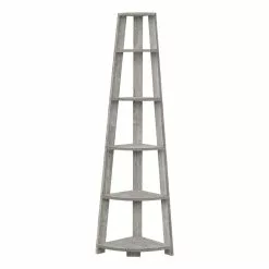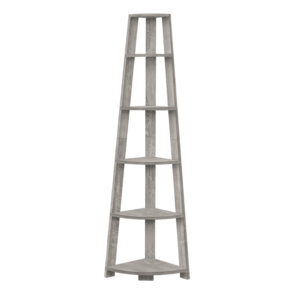 Set up this etagere bookcase easily and let it do its thing! Look how nice the bookcase fits in a corner of your living room, office or bedroom, allowing you to showcase books and all types of decor easily. Make use of a spot that is often tough to work with: the corner. Maximize storage and display with a modern piece that will be sure to help you utilize all the space available to you thanks to 5 fixed tray style shelves. Three sturdy beam legs ensure structural integrity to this corner ladder shelf in industrial grey finished wood look texture. Anti-tipping hardware is included for further stability.
