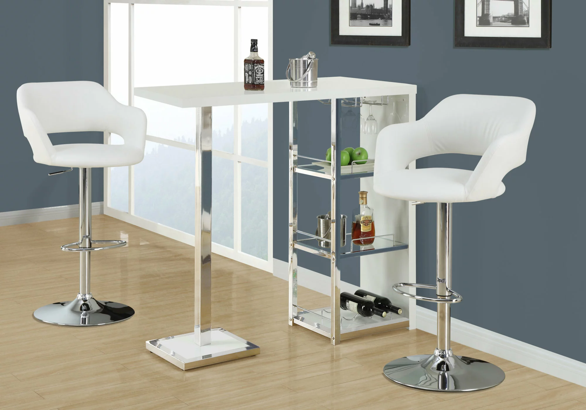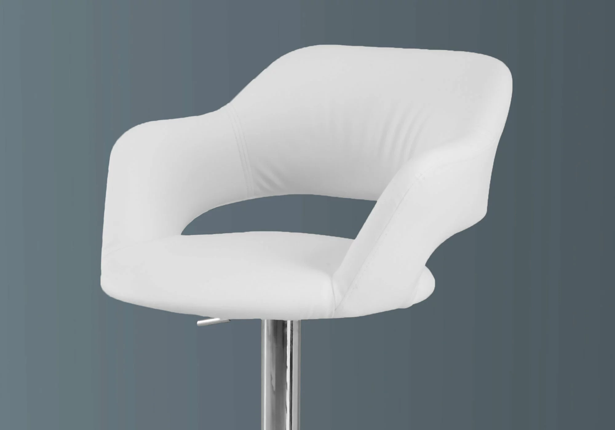 This contemporary bar chair will be a stylish addition to your casual dining and entertainment area. The plush curved stool back and seat is covered in white leather-look fabric to complement your taste. A shiny steel base with a high polished chrome finish supports the chair. The hydraulic lift bar adjusts the seat height from 25 inches to 30 inches high with a footrest below for comfort.