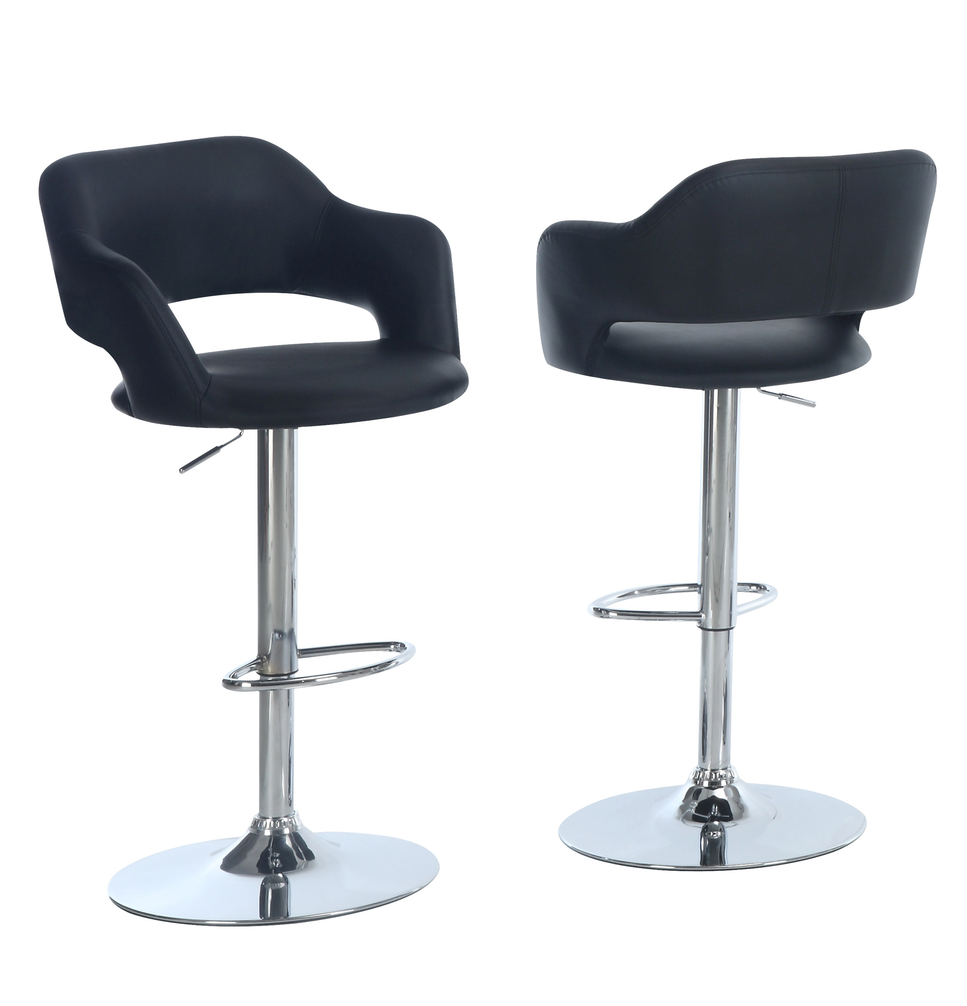 This cool contemporary bar chair will be a stylish addition to your casual dining and entertainment area. The plush curved stool back and seat is covered in black leather-look fabric to complement your taste. A shiny steel base with a high polished chrome finish supports the chair. The hydraulic lift bar adjusts the seat height from with a chrome footrest below for comfort. Transform your home into a fun hangout with this stylish bar stool.