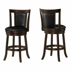 Add a touch of style to any dining area with this set of two bar stools that swivel a full 360 degrees! These black leather-look cushioned stools have sturdy solid wood legs all framed in a beautiful rich cappuccino finish. The well positioned footrest also offers stability and comfort. These counter height chairs are sure to be useful through many evenings of entertainment with friends and family.