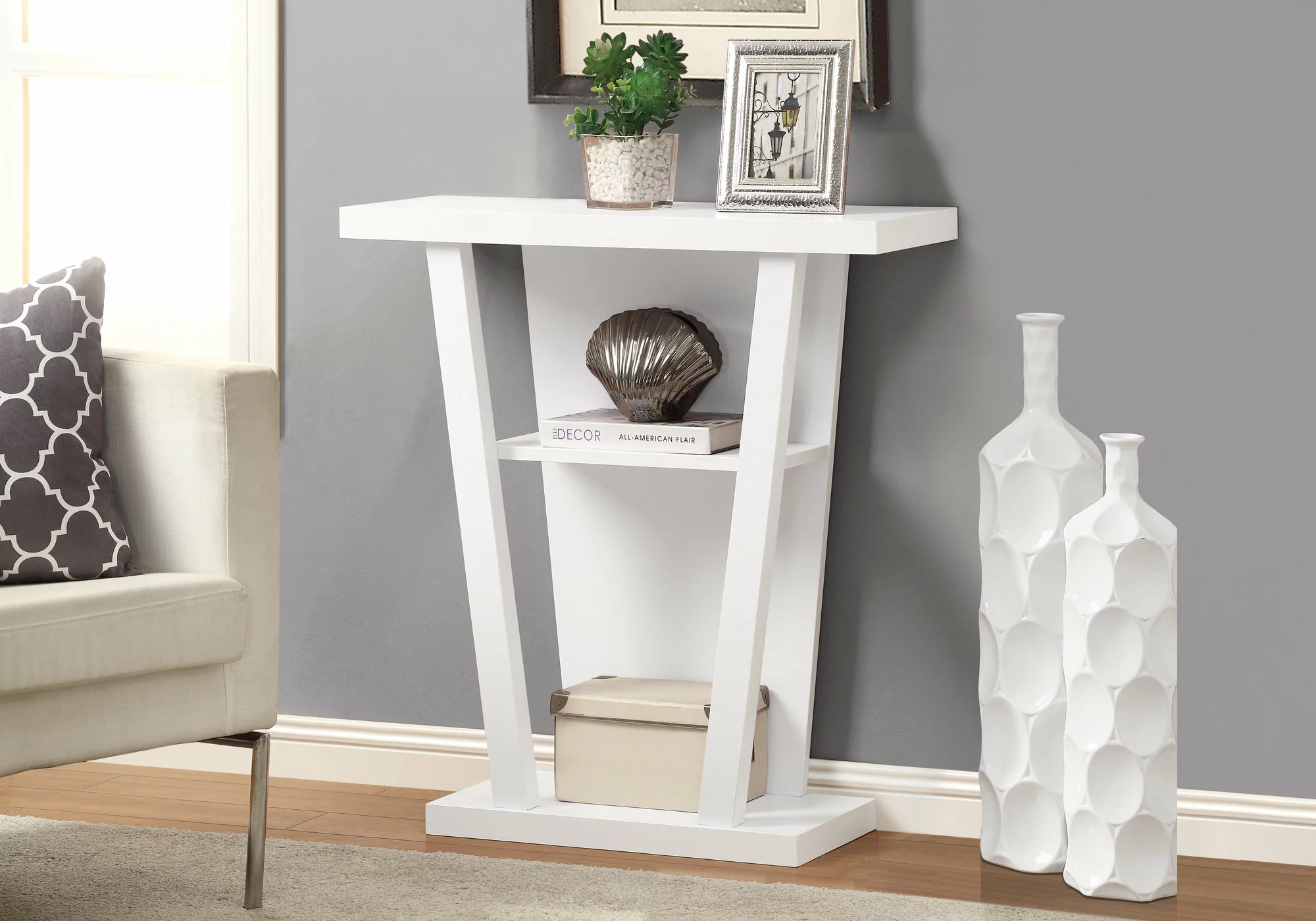 Grab your guests’ attention with this white finished hall console table. This sturdy 32″” long rectangular accent table with symmetrical lines and a unique flair includes a middle shelf for additional storage. Great for displaying pictures, decorative pieces or books, this console table is sure to be a great addition to your hallway, entryway, office, or living room.