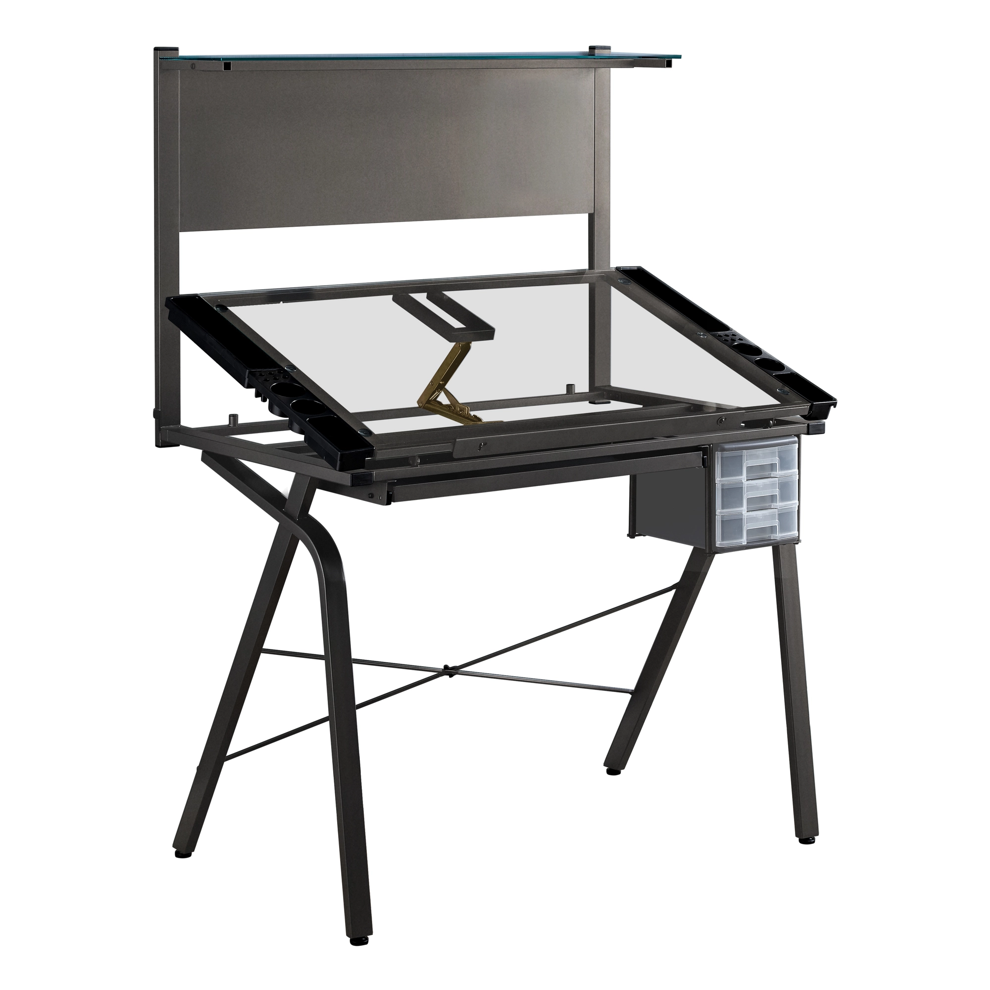 Get your creative juices flowing for your next interior design, renovation or crafting project with this multi-functional, professionally inspired drafting table. Made from strong black metal, the table top has a smooth thick tempered glass surfaces that adjusts up to 5 angles from 25 to 60 degrees. There are multiple options to store your supplies that include 4 interchangeable side plastic trays, 3 fixed sliding plastic drawers and a large metal sliding tray in the middle. The magnetic metal board with 3 magnetic pegs included is perfect to post your inspirations, and this is topped off with a glass shelf to place either decorative objects or additional tools.