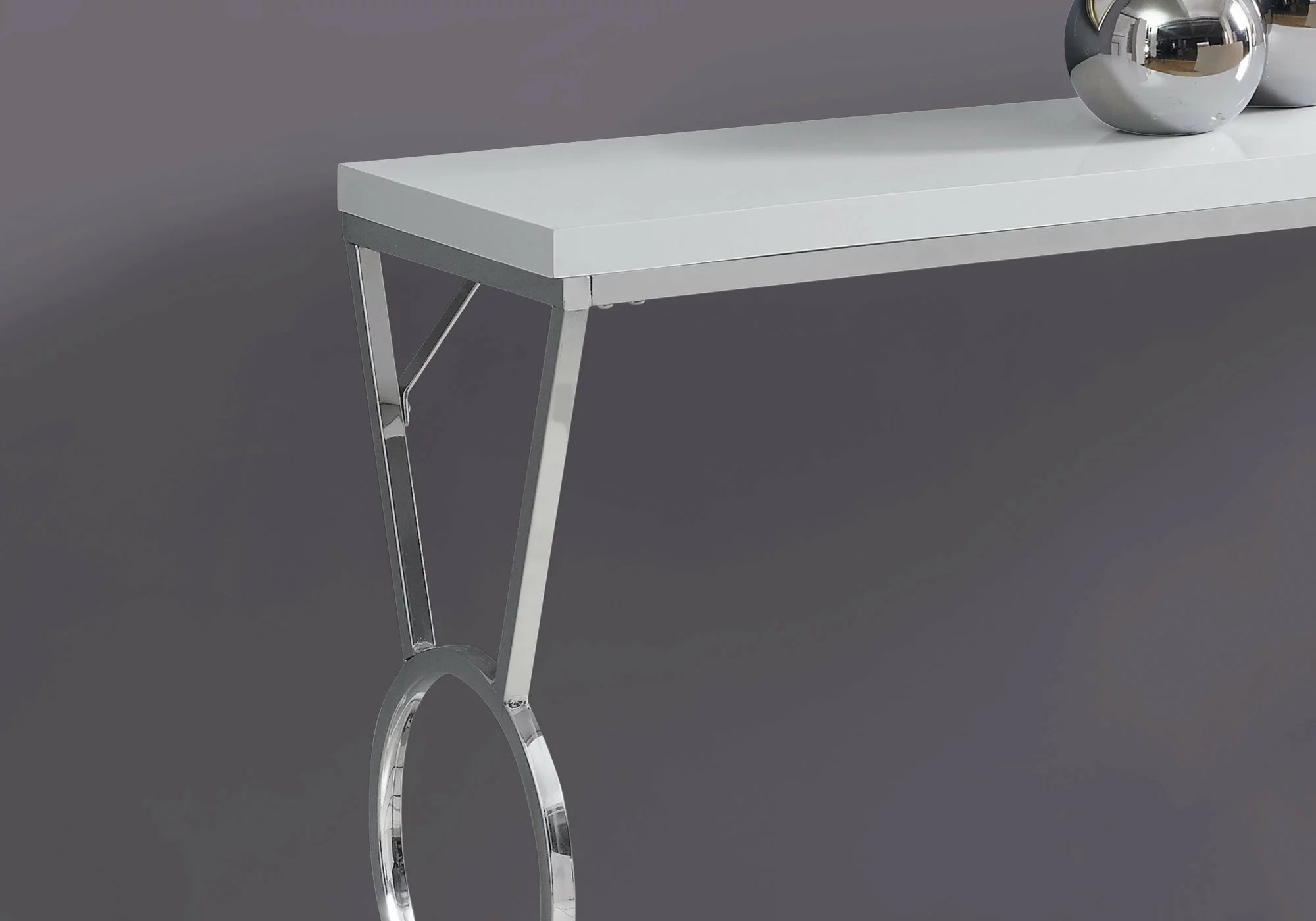 Add a chic appeal to your entryway, hallway or living room with this versatile console accent table. The thick glossy white rectangular tabletop is spacious enough to hold a lamp, pictures, books or decorative objects. The chrome metal base with a unique circle intersected by an “X” leg design makes a statement appeal without overwhelming space and provides solid support. You can easily use this console table as a spot to serve drinks and appetizers while entertaining or even in your home office for added function with style. Compact enough for small spaces, this accent table will become your most useful furniture piece! Assembly is required.