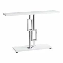 The glossy rectangular white top and base bring a chic aesthetic while the polished geometric chrome base provides all the drama! Show it off in your hallway or entryway as an accent piece to display decorative objects, hold some books or simply to place your keys and mail. Bring it into the living room and use it to set up a drink and appetizer station or behind your sofa for display. Compact enough even for small spaces, this console table will be the most versatile furniture you own. Assembly is required.