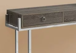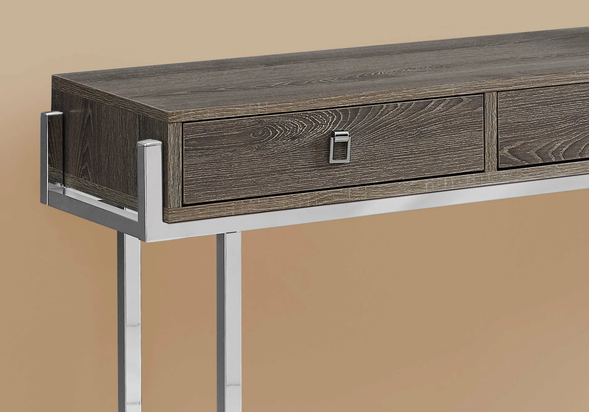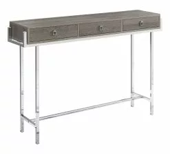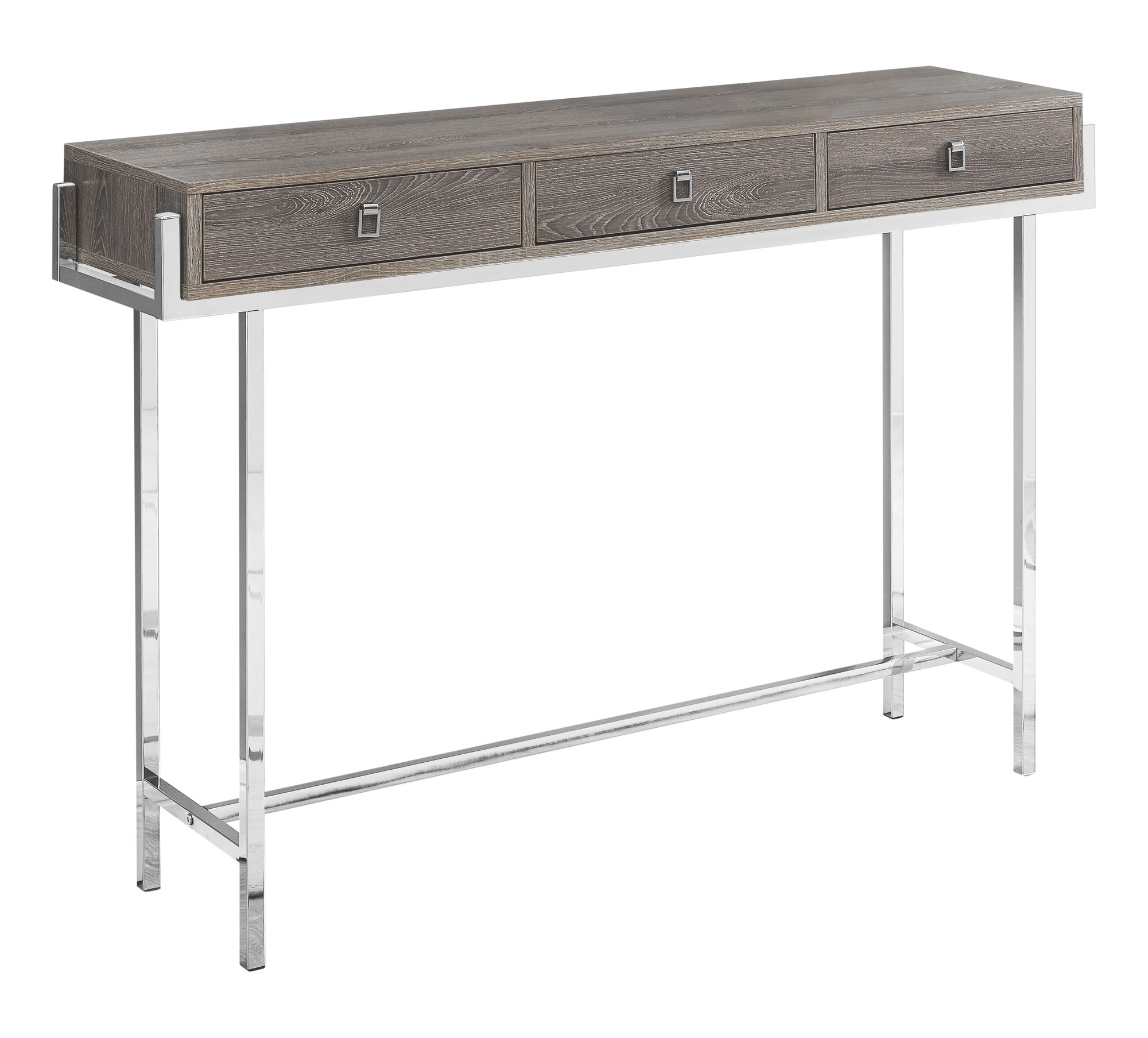 Watch how this modern and fashionable console accent table makes a chic statement in your entryway or living room. The sophisticated dark taupe wood-look finish on all sides, nestled in sleek chrome metal framing that doesn’t overwhelm, this multifunctional console table will quickly become your most wanted accent furniture piece. The spacious rectangular tabletop can hold a lamp, decorative pieces, and books while the 3 drawers with elegant square chrome metal pull stores your papers, keys, and other household items. The compact size is ideal for small spaces whether you set it behind a sofa or against a wall. Assembly is required.