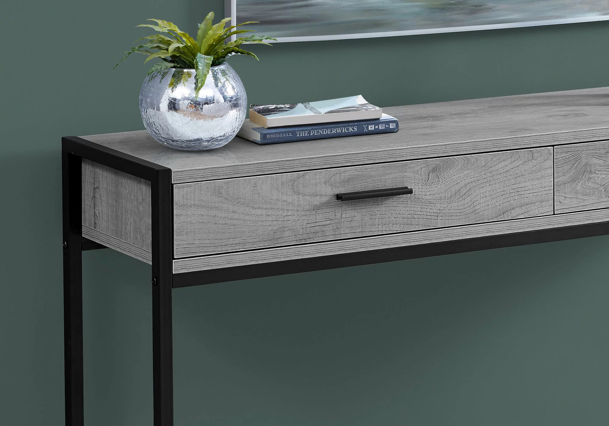 Boost the look of your entryway, hallway with this modern style, rectangular console accent table that contrasts rustic warmth with a chic industrial vibe. Made with high quality MDF material, the smooth laminated grey wood-grain look stands out against the solid black metal square base with its clean minimalist lines. The two handy storage drawers on metal glides are perfect to store keys and paperwork, while the spacious table top can hold books, pictures, decorative objects, or a lamp. This versatile and functional console table will be the most useful furniture piece in your home today! Assembly is required.