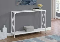 Simple lines and minimal design is what you will find in this contemporary and stylish console accent table. Framed in a chic white metal and accented with an X crossbar design at both ends, the spacious rectangular white tabletop crafted from top quality MDF can easily hold your collectables, magazines, a tray to catch your keys and mail or even as a place to set out some drinks and snacks when entertaining. The laminated bottom shelf offers additional storage to keep everything accessible but neatly in place. Assembly is required.