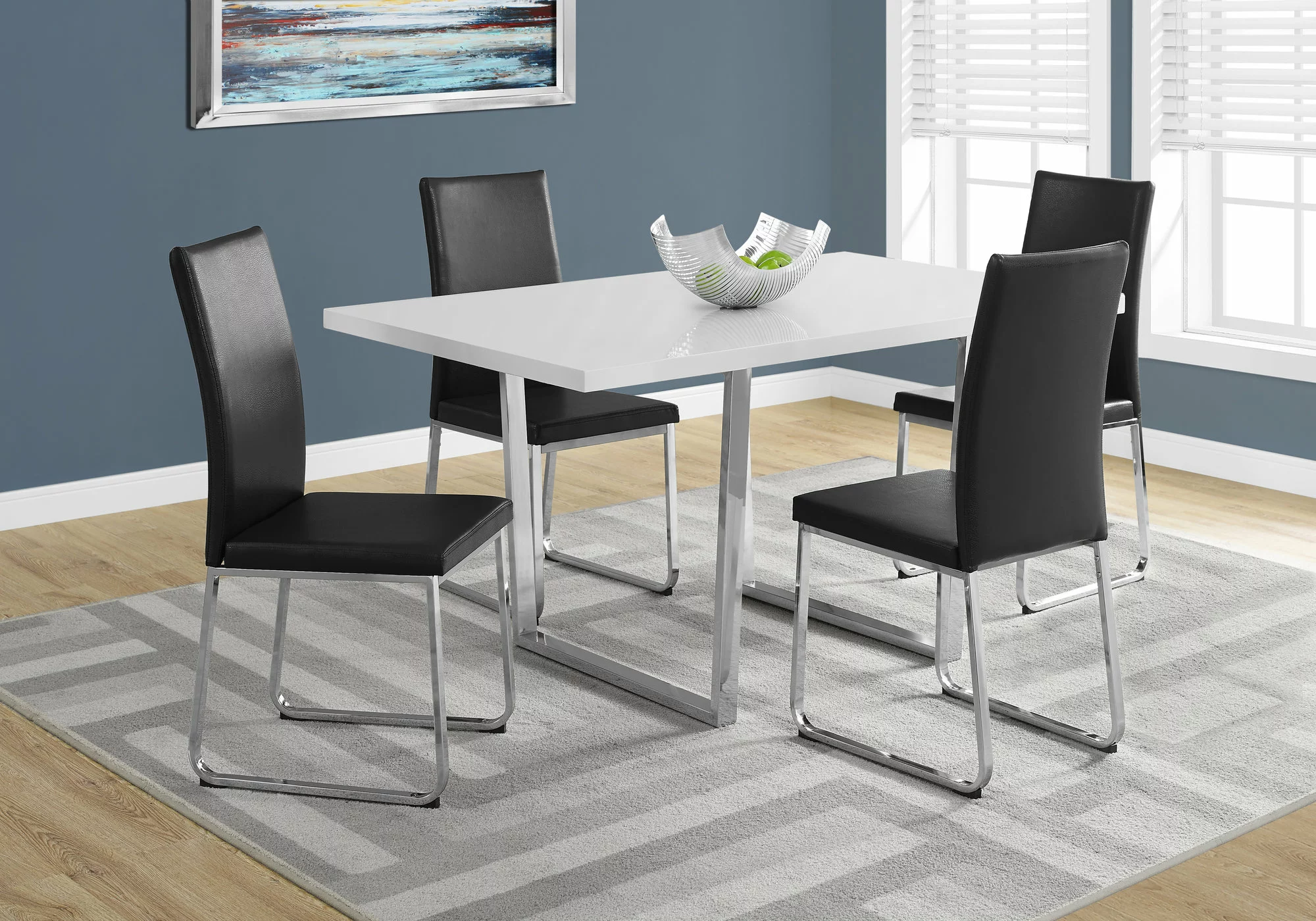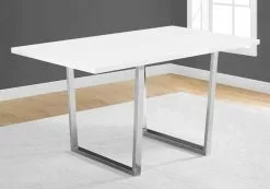 Simple and contemporary, this dining table will bring style to your kitchen. Its large rectangular surface in white is supported by a contrasting chrome metal base. This highly versatile table comfortably accommodates up to 4 people for all your gatherings, whether for a more formal occasion or for a casual evening. The chairs are sold separately.
