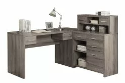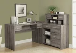 The contemporary appeal of this rich dark taupe wood look L-shaped desk, upgrades your home office with functional storage and work space with style. The spacious desk gives you two work surfaces, which can conveniently be assembled on the left or right-hand sides, offers space for a computer or laptop, a place to write, read or to spread out documents. The desk also features an abundance of drawer storage, a hutch and 3 open shelves, including an adjustable bottom shelf keeping all of your essential supplies within easy reach. This is a must have for any home office.
