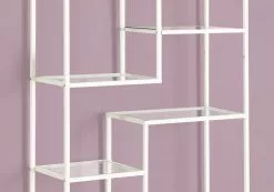 Give your home a bold, modern look with this unique 72″” high white metal and thick tempered glass bookcase. This chic, backless unit features 9 asymmetrical shelves in various sizes, perfect for displaying your favourite books, frames or other decorative items. This stylish unit will be a great addition to your home office, living room, bedroom or even hallway to keep you organized in style.