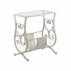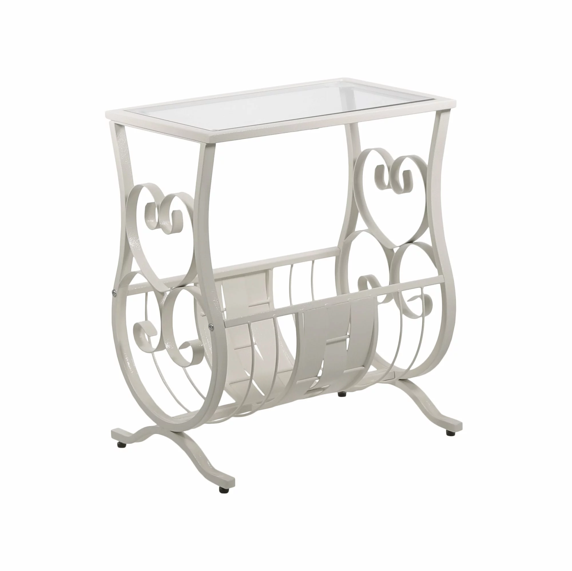 This elegant magazine end table is both stylish and multifunctional. It features an intricate weaved metal rack with curved bars to hold your magazines or books and a rectangular tempered glass top where you can place your coffee cup or a lamp as you read the latest novel. Finished in antique white, this charming accent table is a great addition to a living room, family room, den, or bedroom space.
