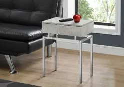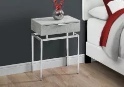 Add a bold statement to your living room or bedroom with this modern accent end table. The rectangular and spacious table top finished in a gray cement-look laminate, made from high quality MDF material features one large storage drawer on metal glides with a discreet silver metal handle. The standout for this table has to be the solid structural chrome metal base with a minimalist yet artistic design. This multifunctional table works just as well in a modern bedroom setting as a nightstand or placed next to a contemporary-style sofa or chair in a living room. Assembly is required.