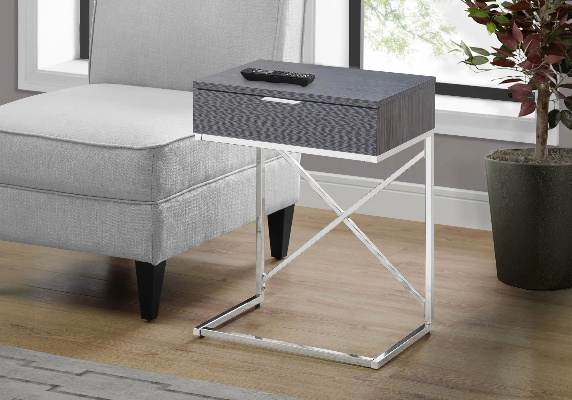 If you are looking to add a simple contemporary touch to your space, start with this accessible multifunctional accent side table. The spacious rectangular table top is constructed from solid MDF material and finished in a chic laminated gray for a modern look. The large storage drawer on metal glides is accented with a simple silver metal handle on top. A minimalist-style chrome metal base with an X design frames the table keeping things. Whether you use this fashionable table as a nightstand in a modern bedroom space or as an end table, it adds instant style to any room!