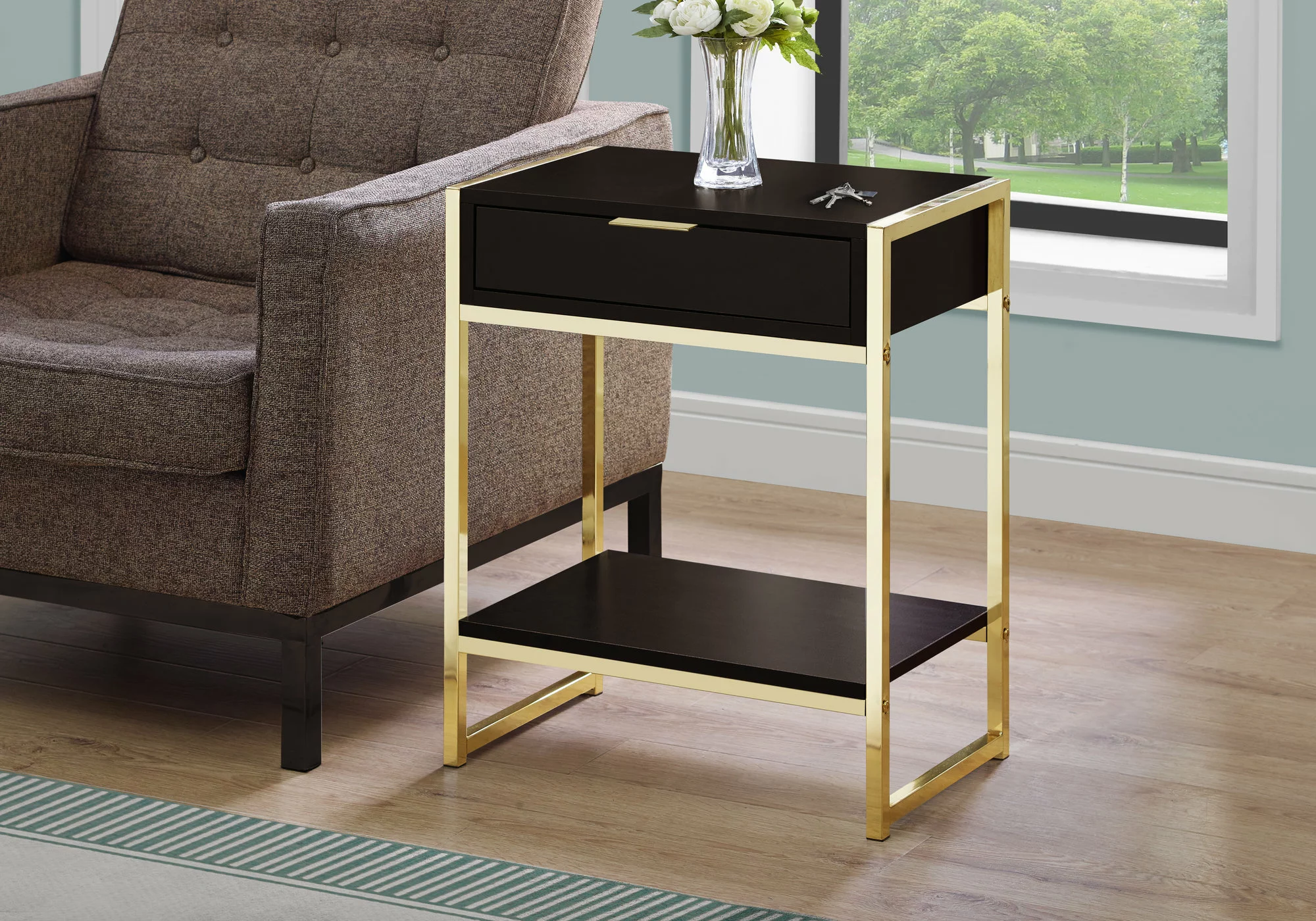 Add instant style to a room with this contemporary multifunctional side/end accent table. It features a spacious rectangular table top with a warm cappuccino finish and one large storage drawer on metal glides with a simple gold metal handle on top. The open bottom shelf in the same finish is handy to store or display more items and the simple square gold metal supports tie it all together in an effortless design. Bring this accent table into the bedroom as a chic nightstand, place it next to your modern sofa or arm chair as a useful side table. The compact size also makes it ideal for smaller spaces. Assembly is required.