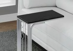 What a convenient way to eat, drink, or work from your couch! This beautiful black finished accent table has sufficient space for you to place your snacks, laptop, drinks or even meals. The elegant metal base provides sturdy support along with a fashionable flair that will suit any décor.