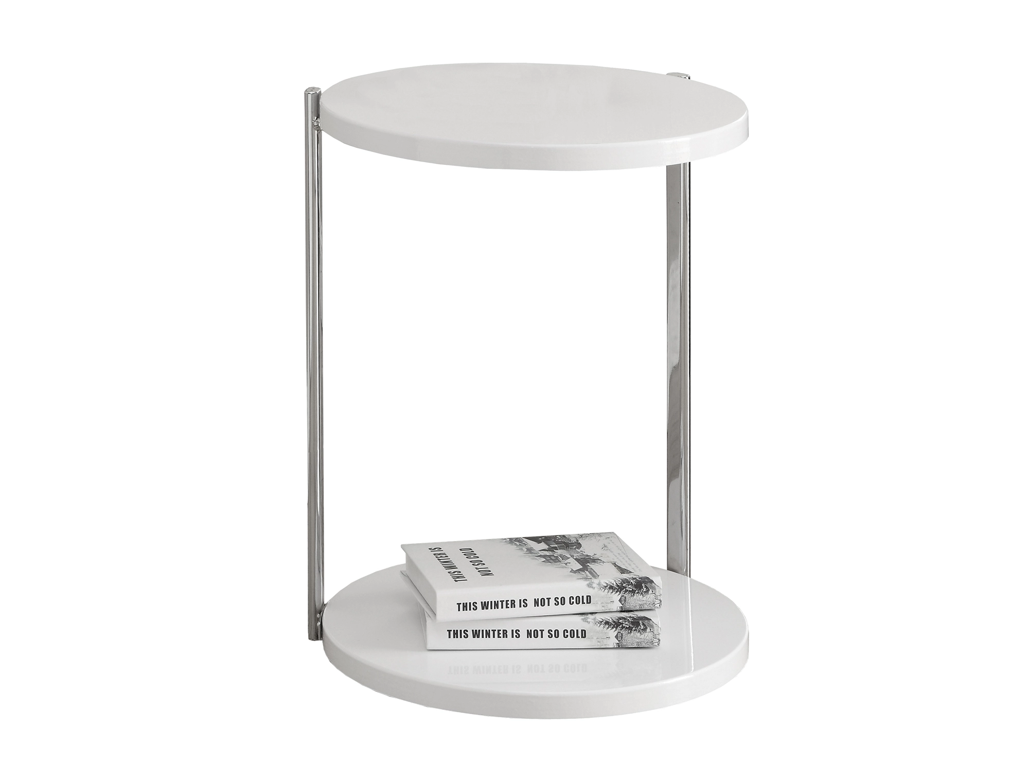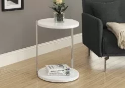 To have or not to have just isnโt a question! This stylish glossy white round accent table offers a simple yet convenient place to put down your drinks, snacks, meals or even a tablet while lounging on your couch or entertaining. The sturdy yet fashionable chrome metal supports with an extra shelf at the bottom provide additional storage for this must-have table. Use this versatile contemporary snack and accent table for your living room, office space, family room or den.