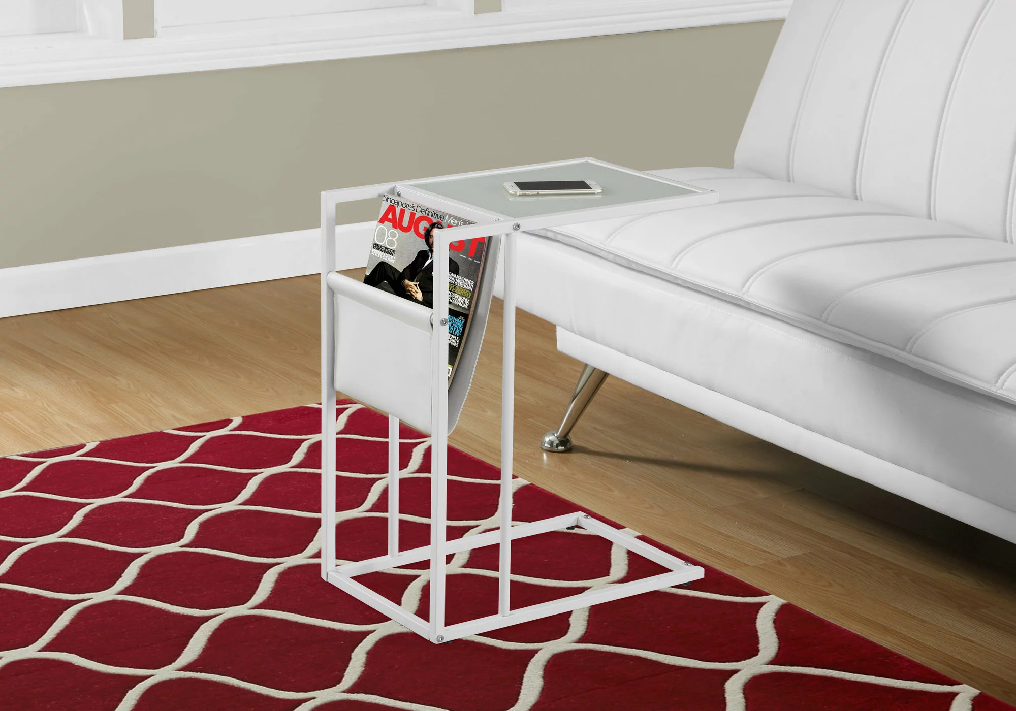 This multifunctional contemporary style accent table is perfect to use as a snack or side table for any space in your home. The thick rectangular frosted tempered glass table top provides sufficient space to place snacks, drinks, media devices or decorative objects, while the handy white leather-look magazine holder adds a storage element that helps keep everything organized. The white metal base provides sturdy support along with a fashionable touch that will suit any décor.