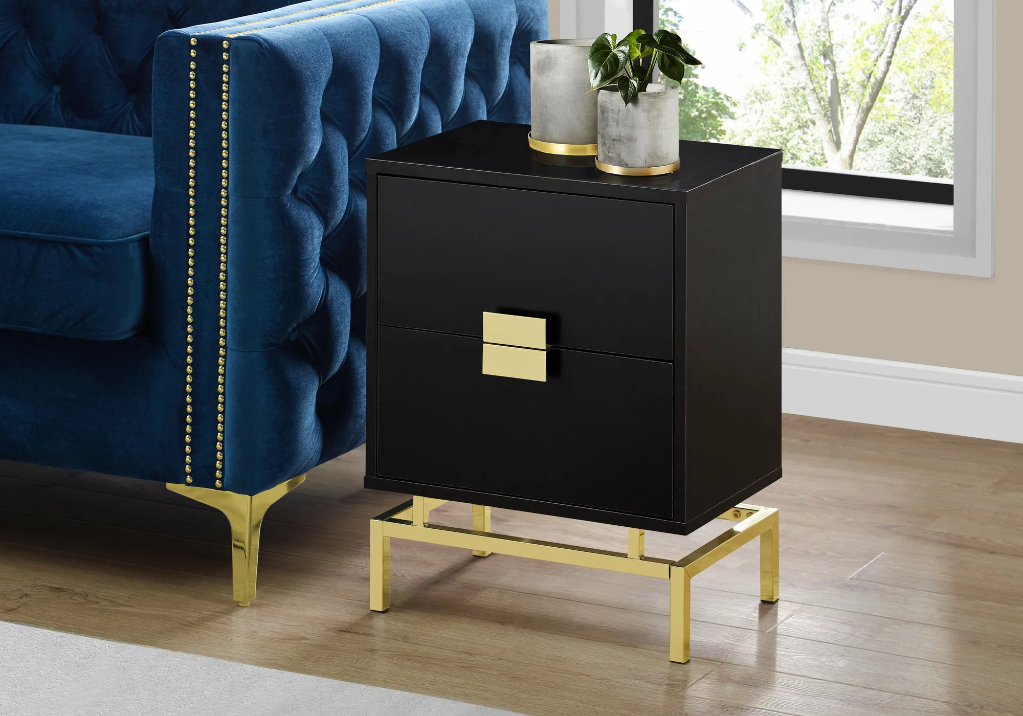 This retro inspired side/end accent table gives a modern glamorous look to a room. Finished in a stylish laminated cappuccino on all sides, with two large storage drawers on metal glides accented with chic gold metal drawer pulls that meet together as one. The bold yet simple gold metal base elevates this accent table to another dimension. Versatile to use as a nightstand for a modern bedroom or next to a sofa or chair as a side table, this is one statement making accent furniture piece. Assembly is required.