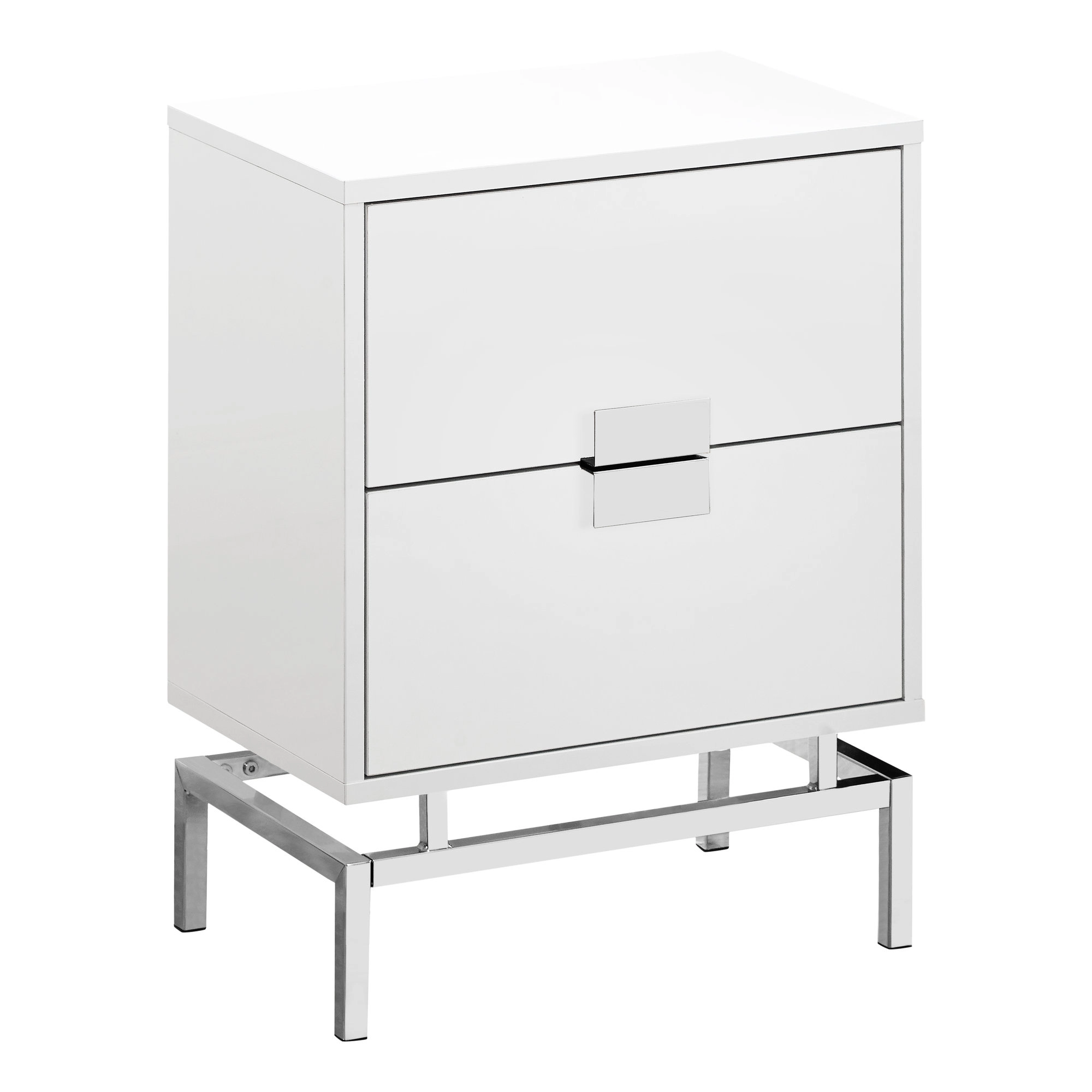 This retro-inspired side/end accent table gives a modern glamorous look to a room. Finished in a stylish laminated glossy white on all sides, with two large storage drawers on metal glides accented with chic silver metal drawer pulls that meet together as one. The bold yet simple silver chrome metal base elevates this accent table to another dimension. Versatile to use as a nightstand for a modern bedroom or next to a sofa or chair as a side table, this is one statement making accent furniture piece. Assembly is required.