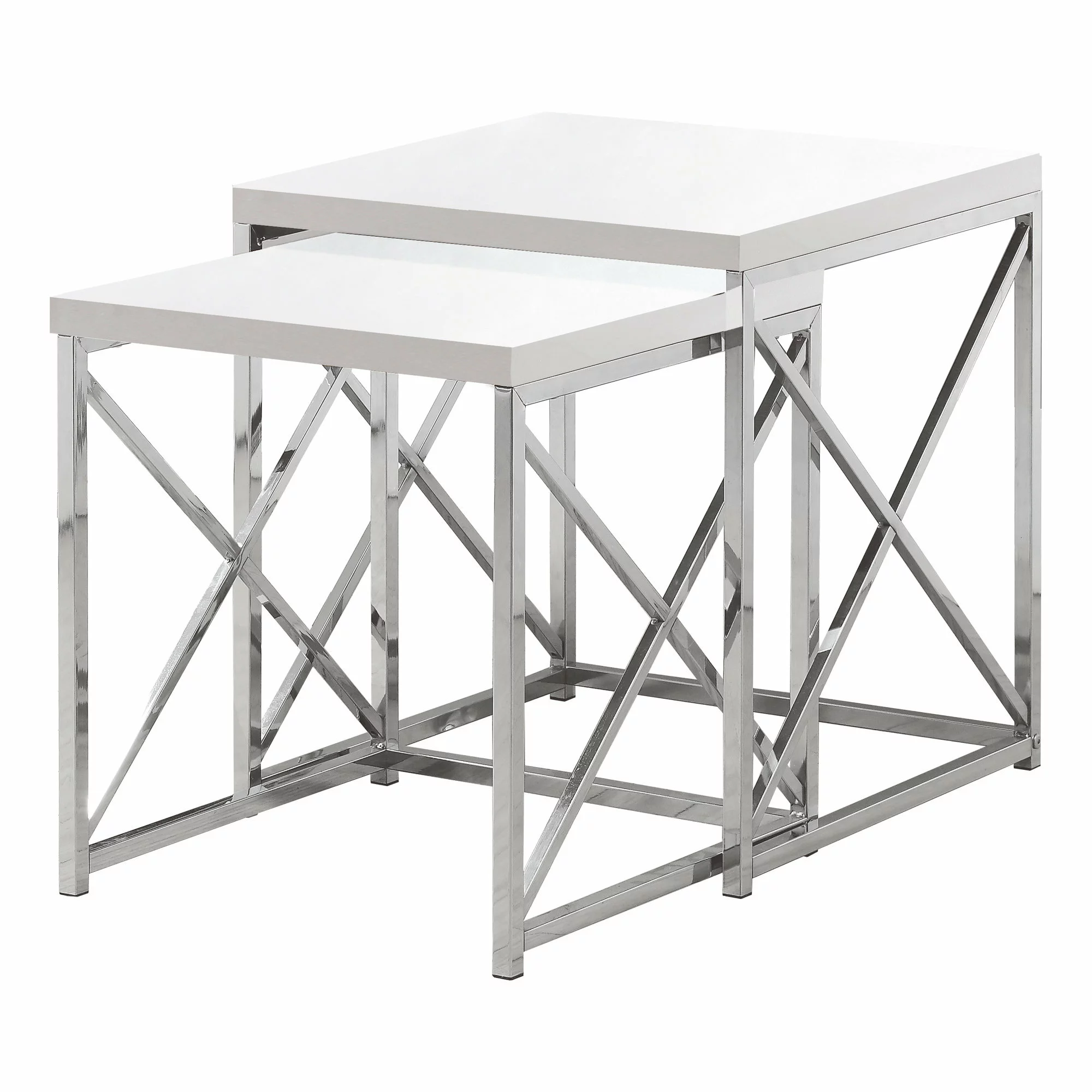 With chic glossy square white tops, this 2 pieces nesting table set gives an exceptional look to any room. The stylish criss-cross chrome metal base and sides provide sturdy support with a contemporary look. Use this multifunctional set as end tables, lamp tables, decorative display tables, or simply as accent pieces.
