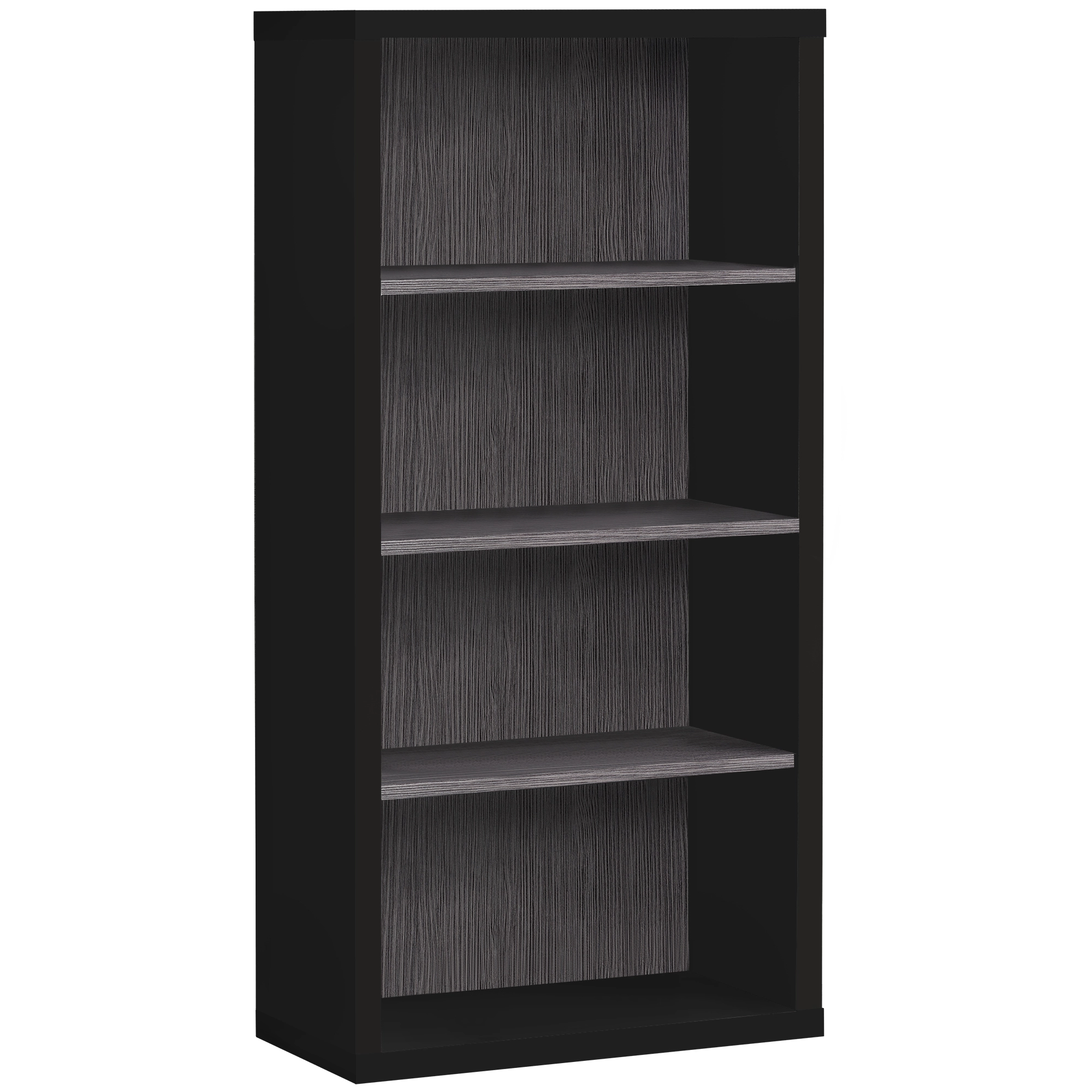 The modern look of this chic 48″” bookcase finished in black and grey wood look is the perfect combination of design and function. With clean lines and thick panels, this bookcase will keep you organized in style. Featuring three adjustable shelves to accommodate various sized books and decorative objects, this bookcase can stand alone or be paired with the matching desk and mobile stand for your home office, bedroom, family room, or living room. Tipping hardware included.
